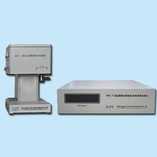 RFL-2型超微弱化学发光/生物发光检测仪是专用于测量微弱发光信号的测量仪器,仪器带有能量测试和电荷积分测试等两种测量方式,具有非常宽的动态测试范围,适用于各种具有配有光电检测器(如光电倍增管、光电管、光电二级管等)的分析装置,如化学发光分析、荧光分析、火焰分子(原子)发射光谱分析等。本仪器内置高精度负高压电源和高精度信号放大及信号处理系统及VFD数字显示器。其中负高压电源为光电倍增管专用,而信号放大器则用于对光电转换后的信号进行放大、滤波,信号处理系统则对被测信号进行相关处理及传递给系统计算机进行分析,VFD显示器则用于显示各种测量参数及信号值。本仪器配备的AOL-1型全光谱超微弱光检测器,与主机构成了RFL-2型超微弱化学发光/生物发光检测仪。